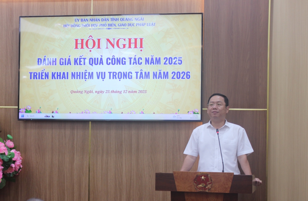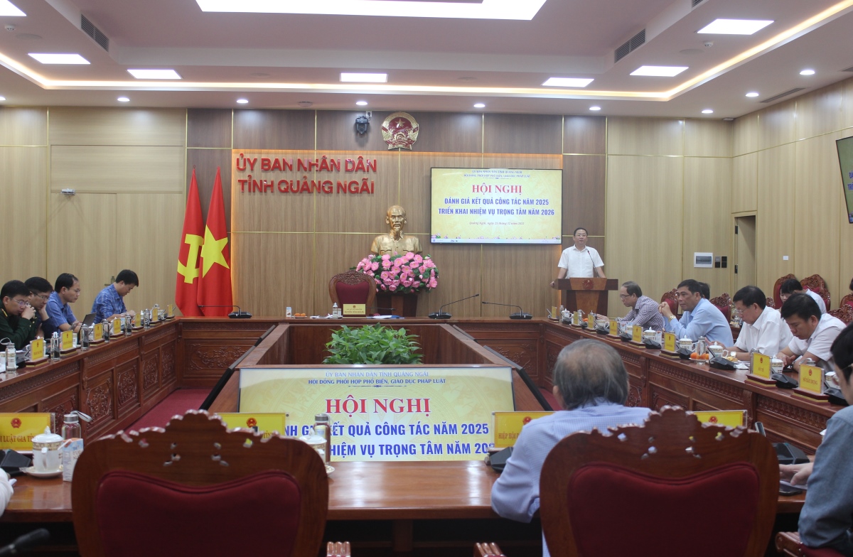 Thực hiện Quy chế hoạt động của Hội đồng Phối hợp phổ biến, giáo dục pháp luật tỉnh Quảng Ngãi (viết tắt là Hội đồng), chiều ngày 25/12/2025, Hội đồng đã tổ chức hội nghị đánh giá kết quả nhiệm vụ công tác của Hội đồng năm 2025 và triển khai nhiệm vụ trọng tâm năm 2026. Chủ trì hội nghị là Phó Chủ tịch UBND tỉnh – Chủ tịch Hội đồng Nguyễn Công Hoàng; cùng dự có Giám đốc Sở Tư pháp - Phó Chủ tịch Thường trực Hội đồng Trà Thanh Danh, các thành viên Hội đồng, Tổ Thư ký giúp việc Hội đồng, phóng viên báo, đài, cổng TTĐT tỉnh cũng đến dự và đưa tin.