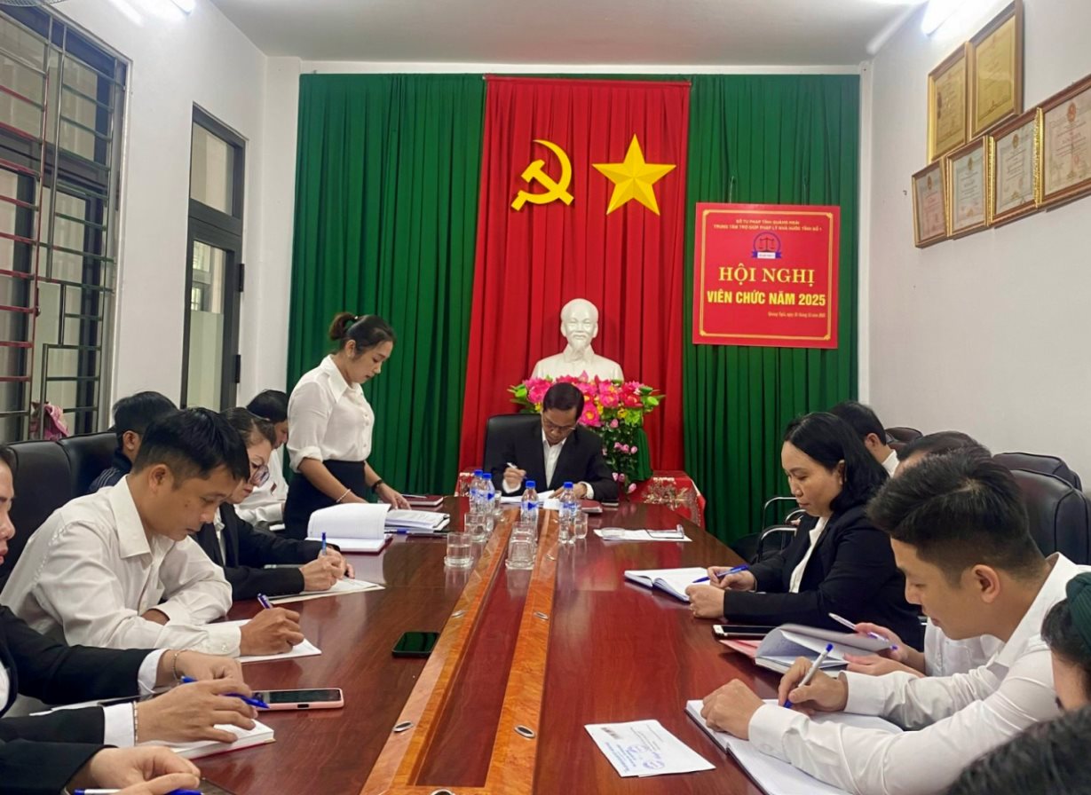 Thực hiện Luật Thực hiện dân chủ ở cơ sở năm 2022; Nghị định số 59/2023/NĐ-CP ngày 14/8/2023 của Chính phủ quy định chi tiết một số điều của Luật Thực hiện dân chủ ở cơ sở; Công văn số 1521/STP-VP ngày 24/12/2025 của Sở Tư Pháp tỉnh Quảng Ngãi về việc chuẩn bị nội dung tổ chức Hội nghị công chức, viên chức, người lao động năm 2025. Chiều ngày 31 tháng 12 năm 2025, Trung tâm Trợ giúp pháp lý Nhà nước tỉnh số 1 long trọng tổ chức Hội nghị viên chức năm 2025 với sự tham dự đông đủ của tất cả viên chức Trung tâm