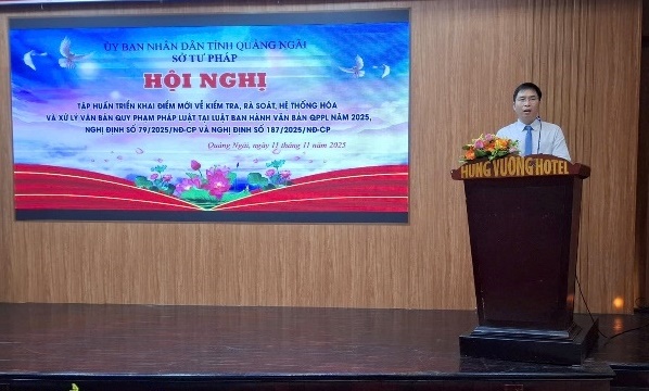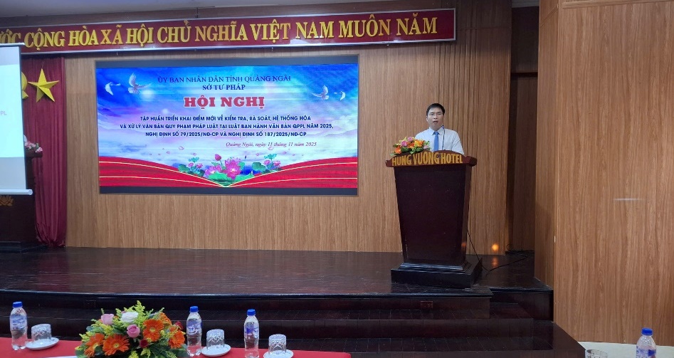 Thực hiện Kế hoạch số 56/KH-UBND ngày 08/10/2025 của Ủy ban nhân dân tỉnh triển khai thi hành Luật Ban hành văn bản quy phạm pháp luật và Quyết định số 48/QĐ-STP ngày 04/8/2025 của Giám đốc Sở Tư pháp ban hành Chương trình công tác trọng tâm Qúy III, Qúy IV năm 2025 của Sở Tư pháp tỉnh Quảng Ngãi; sáng ngày 11/11/2025, Sở Tư pháp tổ chức hội nghị triển khai điểm mới về kiểm tra, rà soát, hệ thống hóa và xử lý văn bản quy phạm pháp luật tại Luật Ban hành văn bản quy phạm pháp luật năm 2025, Nghị định số 79/2025/NĐ-CP ngày 01/4/2025 của Chính phủ về kiểm tra, rà soát, hệ thống hóa và xử lý văn bản quy phạm pháp luật và Nghị định số 187/2025/NĐ-CP ngày 01/7/2025 của Chính phủ sửa đổi, bổ sung một số điều của Nghị định số 78/2025/NĐ-CP ngày 01/4/2025 của Chính phủ quy định chi tiết một số điều và biện pháp để tổ chức, hướng dẫn thi hành Luật Ban hành văn bản quy phạm pháp luật và công tác pháp chế cho cán bộ, công chức trên địa bàn tỉnh.