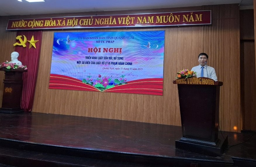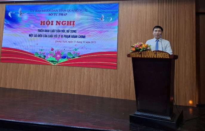 Thực hiện Kế hoạch số 38/KH-UBND ngày 04/9/2025 của Ủy ban nhân dân tỉnh triển khai thi hành Luật sửa đổi, bổ sung một số điều của Luật Xử lý vi phạm hành chính trên địa bàn tỉnh Quảng Ngãi; Kế hoạch số 20/KH-STP ngày 15/9/2025 của Sở Tư pháp triển khai thi hành Luật sửa đổi, bổ sung một số điều của Luật Xử lý vi phạm hành chính và Quyết định số 48/QĐ-STP ngày 04/8/2025 của Giám đốc Sở Tư pháp ban hành Chương trình công tác trọng tâm Quý III, Quý IV năm 2025 của Sở Tư pháp tỉnh Quảng Ngãi; Chiều ngày 11/11/2025, Sở Tư pháp tổ chức hội nghị triển khai Luật sửa đổi, bổ sung một số điều của Luật Xử lý vi phạm hành chính cho cán bộ, công chức trên địa bàn tỉnh.