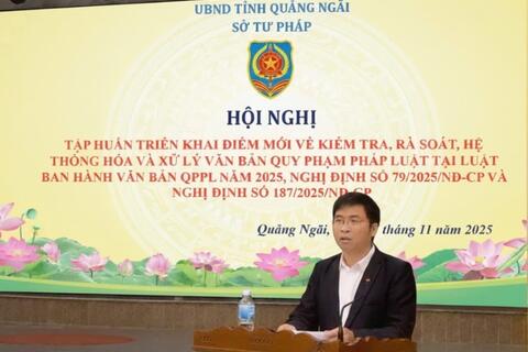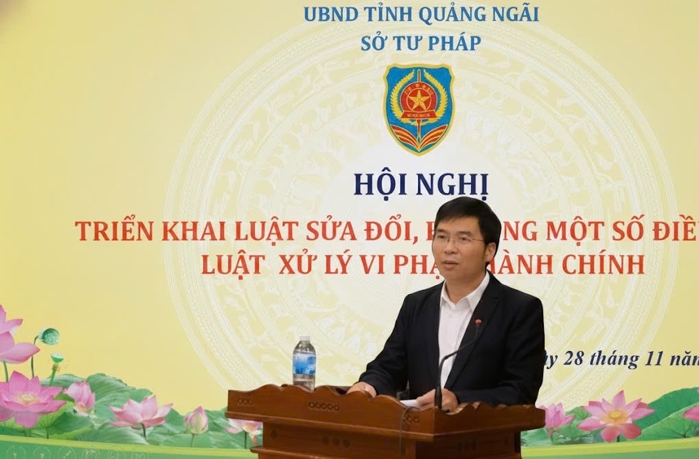 Tiếp tục thực hiện Kế hoạch số 38/KH-UBND ngày 04/9/2025 của Ủy ban nhân dân tỉnh triển khai thi hành Luật sửa đổi, bổ sung một số điều của Luật Xử lý vi phạm hành chính trên địa bàn tỉnh Quảng Ngãi; Kế hoạch số 20/KH-STP ngày 15/9/2025 của Sở Tư pháp triển khai thi hành Luật sửa đổi, bổ sung một số điều của Luật Xử lý vi phạm hành chính và Quyết định số 48/QĐ-STP ngày 04/8/2025 của Giám đốc Sở Tư pháp ban hành Chương trình công tác trọng tâm Quý III, Quý IV năm 2025 của Sở Tư pháp tỉnh Quảng Ngãi; sáng ngày 28/11/2025, Sở Tư pháp đã tổ chức hội nghị triển khai Luật sửa đổi, bổ sung một số điều của Luật Xử lý vi phạm hành chính cho đại diện Lãnh đạo cùng với công chức của UBND 40 xã, phường phía tây của tỉnh.