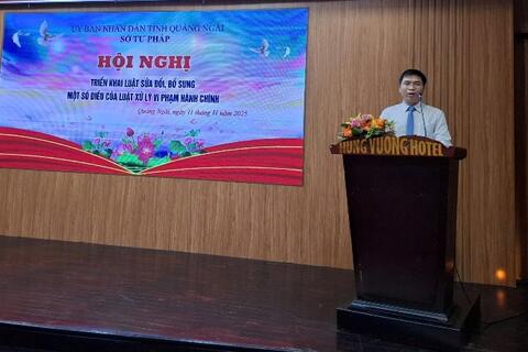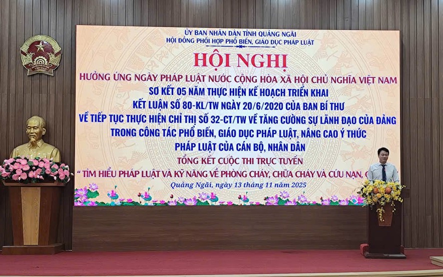 Theo đó, Hội nghị hưởng ứng Ngày Pháp luật Việt Nam năm 2025 được tổ chức vào sáng ngày 13/11/2025 tại Hội trường Uỷ ban nhân dân tỉnh. Đồng chí Trà Thanh Danh, Tỉnh ủy viên, Giám đốc Sở Tư pháp, Phó Chủ tịch Thường trực Hội đồng Phối hợp phổ biến, giáo dục pháp luật tỉnh, Trưởng ban Tổ chức Cuộc thi chủ trì Hội nghị. Đồng thời, tại Hội nghị còn có sự tham dự của các Phó Chủ tịch Hội đồng và Ủy viên Hội đồng Phối hợp phổ biến, giáo dục pháp luật tỉnh; đại diện lãnh đạo Uỷ ban nhân dân các xã, phường, đặc khu; lãnh đạo Văn phòng HĐND và UBND (phụ trách lĩnh vực công tác tư pháp); thành viên Ban Tổ chức Cuộc thi; Tổ thư ký (giúp việc Ban Tổ chức); Tổ Thư ký giúp việc Hội đồng Phối hợp phổ biến, giáo dục pháp luật tỉnh. Lãnh đạo, công chức các phòng, đơn vị trực thuộc Sở Tư pháp; đại diện các tập thể, cá nhân được biểu dương, khen thưởng. Các cá nhân đạt giải thưởng trong Cuộc thi; Phóng viên Báo và Phát thanh, Truyền hình Quảng Ngãi; Cổng Thông tin điện tử tỉnh; Trang Thông tin điện tử Phổ biến, giáo dục pháp luật tỉnh.
